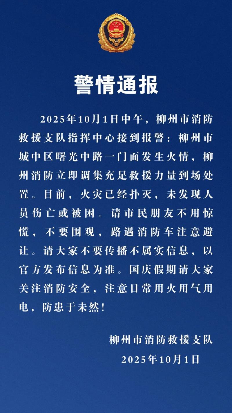 10月1日下午1时许,柳州市消防救援支队发布一则警情通报: 2025年10月1日中午,柳州市消防救援支队指挥中心接到报警:柳州市城中区...